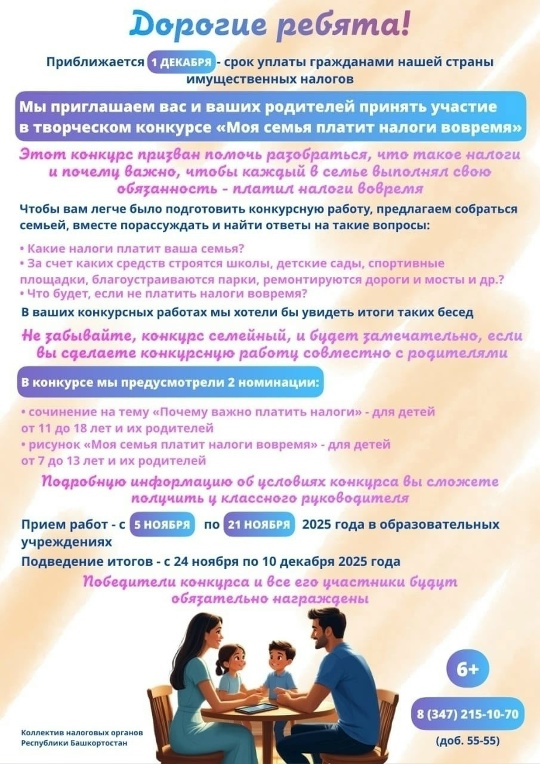 В целях пополнения доходов консолидированного бюджета Республики Башкортостан и побуждения граждан к добровольной уплате налогов, повышения финансовой и налоговой культуры и грамотности подрастающего поколения УФНС России по Республике Башкортостан совместно с ГАУ ДПО ИРО РБ организована совместная акция «Моя семья платит налоги вовремя».